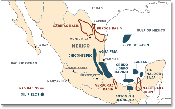 Onshore gas mostly comes from the onshore Burgos basin in the north and the southern region west of the Campeche Bay. Output is increasing as use is now being made of offshore gas in Campeche Bay that has in the past been flared or re-injected.