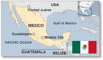 Mexico (the United Mexican States) is a federal republic bordered by the USA (north) and Guatemala and Belize (south). The Pacific Ocean lies to the west and the Gulf of Mexico and Caribbean to the east.