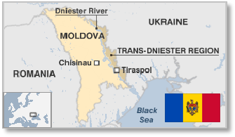Moldova (the Republic of Moldova) is land-locked, bordering Romania (west) and Ukraine (north, east, and south). A strip of land in the east has been under the control of Transnistria (or Trans-Dniester) since 1990.